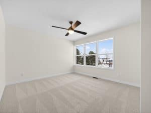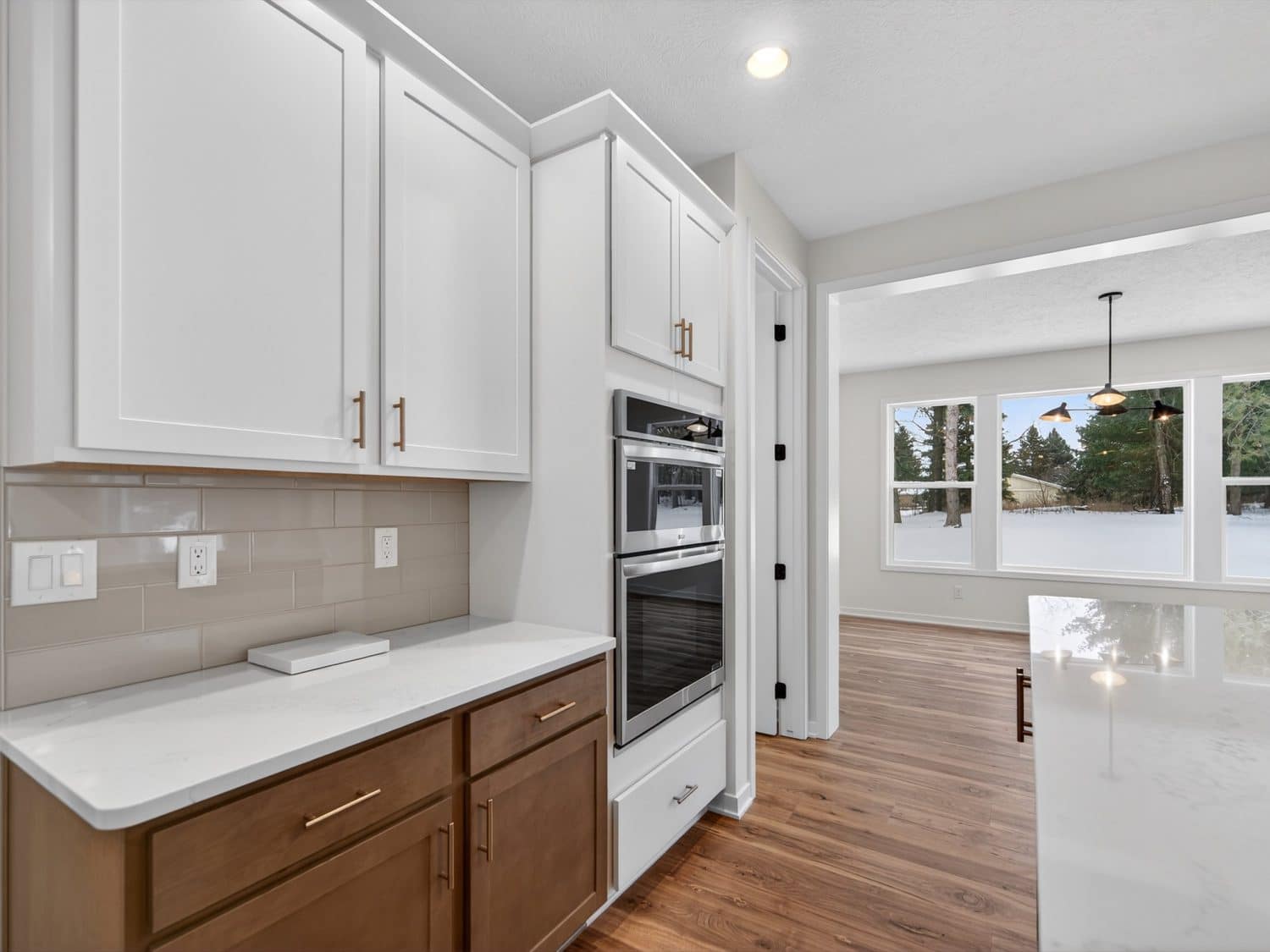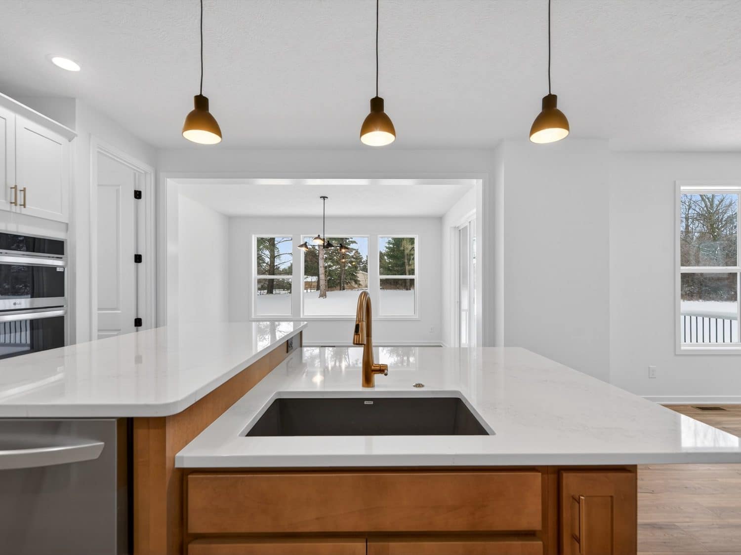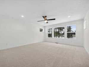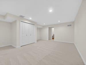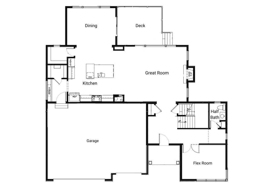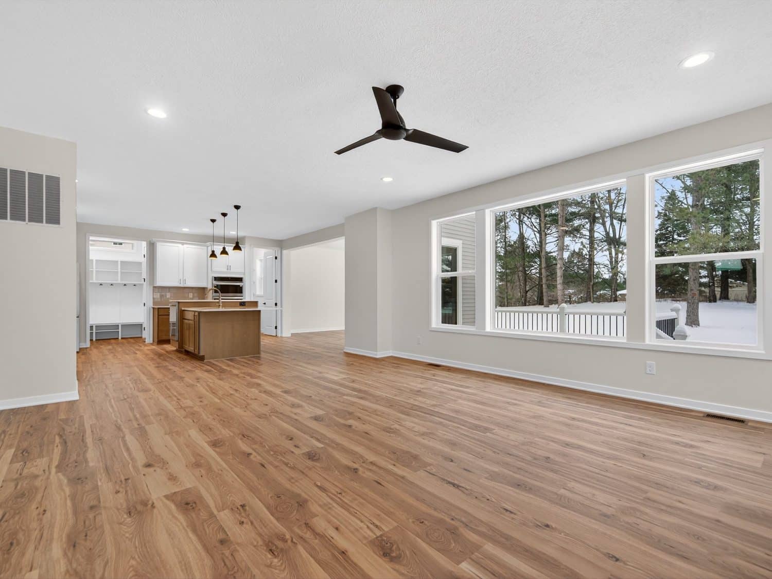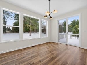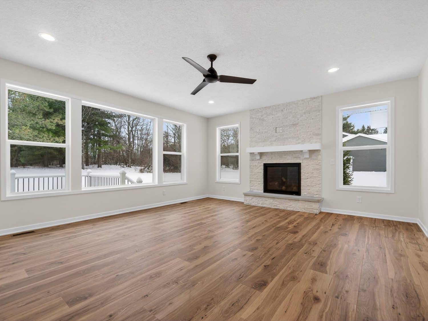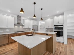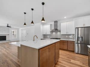 The main level features an open great room centered around a gas fireplace with a full-height stone wall, creating a warm and inviting atmosphere. A nearby flex room with double French doors provides the perfect space for a home office or quiet retreat. The gourmet kitchen showcases a premium LG appliance package, quartz countertops, and an oversized island ideal for entertaining. A maintenance-free vinyl deck with Trex railing extends the living area outdoors, providing the perfect setting to relax or dine al fresco.