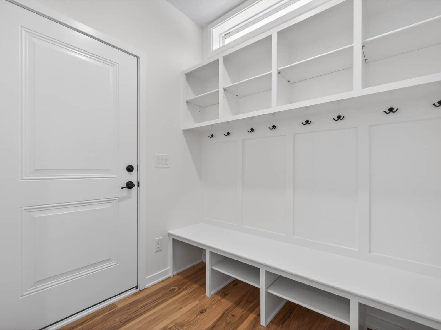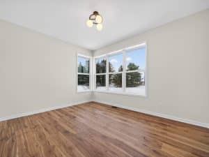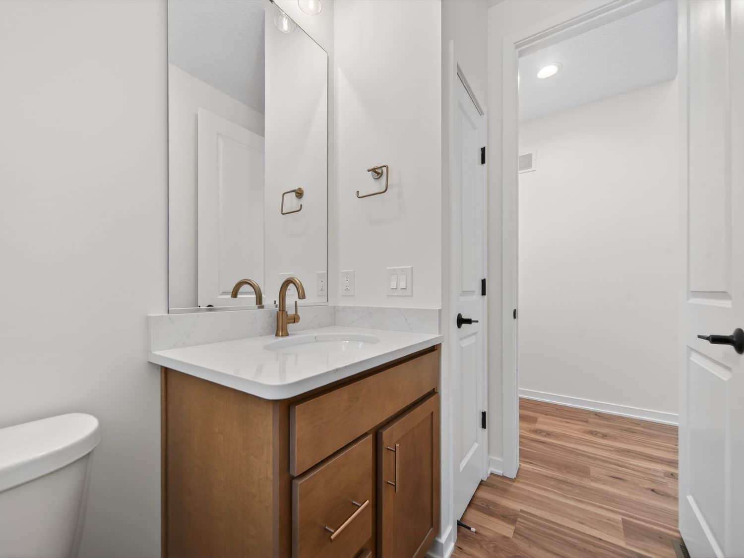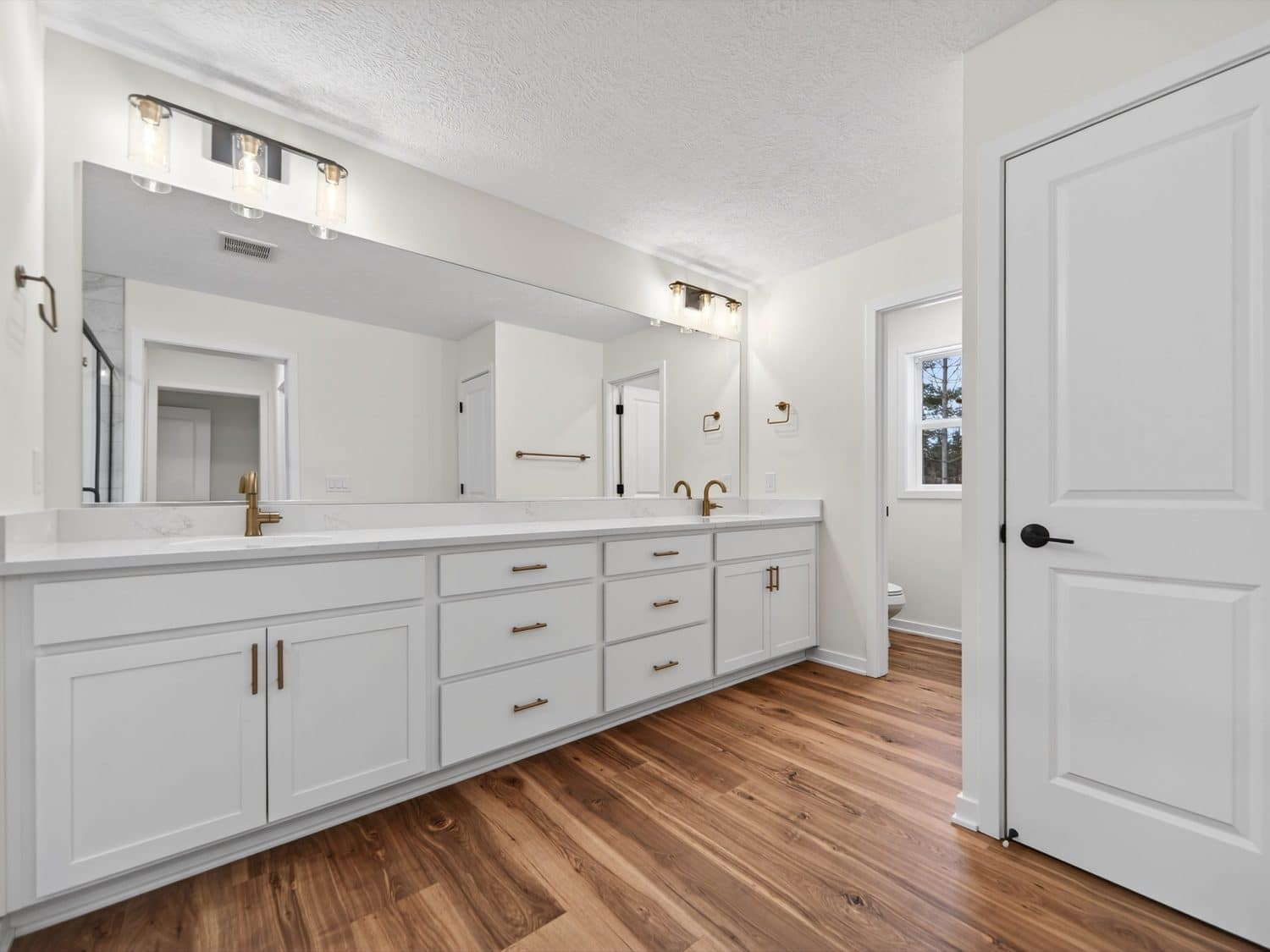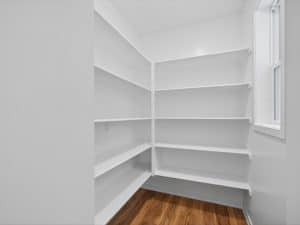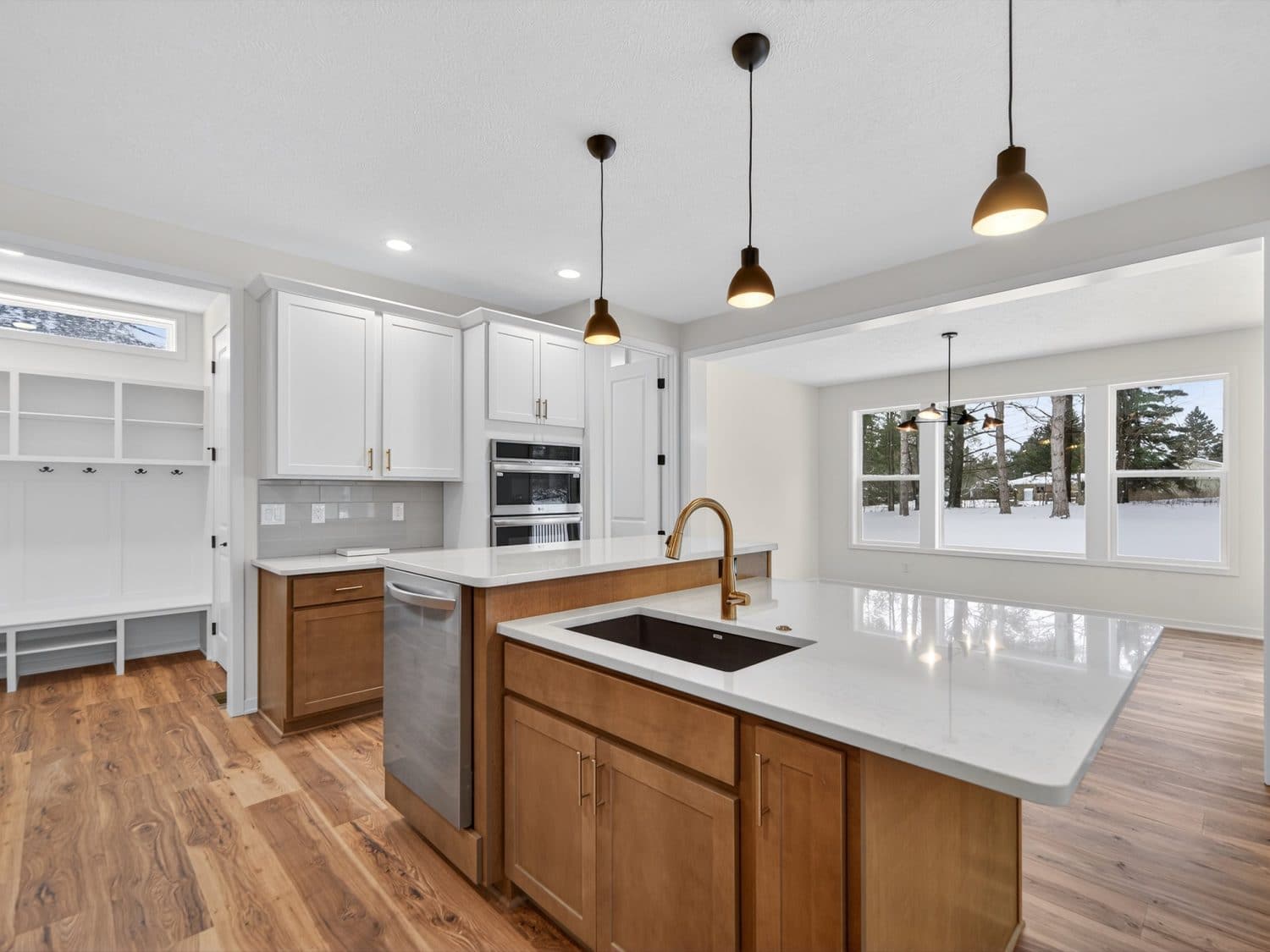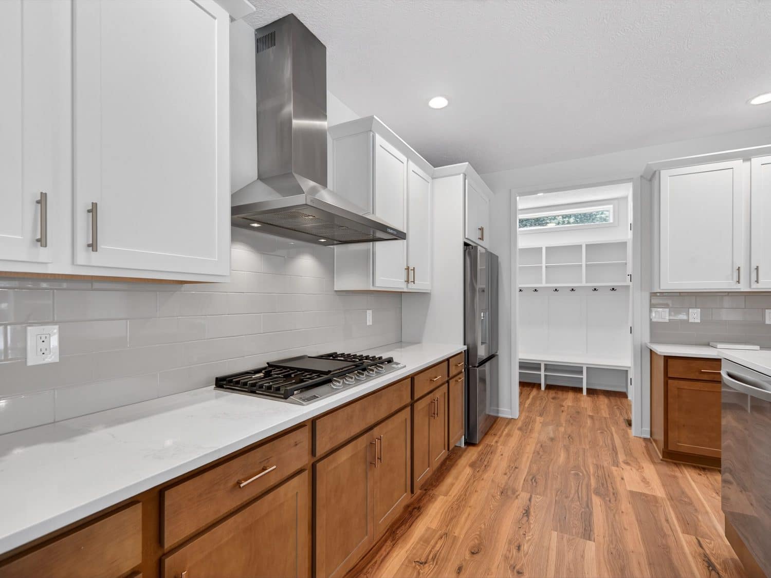 The main level features an open great room centered around a gas fireplace with a full-height stone wall, creating a warm and inviting atmosphere. A nearby flex room with double French doors provides the perfect space for a home office or quiet retreat. The gourmet kitchen showcases a premium LG appliance package, quartz countertops, and an oversized island ideal for entertaining. A maintenance-free vinyl deck with Trex railing extends the living area outdoors, providing the perfect setting to relax or dine al fresco.